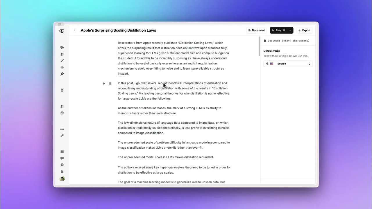 Import any existing document - PDFs, Word documents, EPUBs, or directly from platforms like Substack and Medium. Generate expressive audio content from your favorite writing and publishing platform.